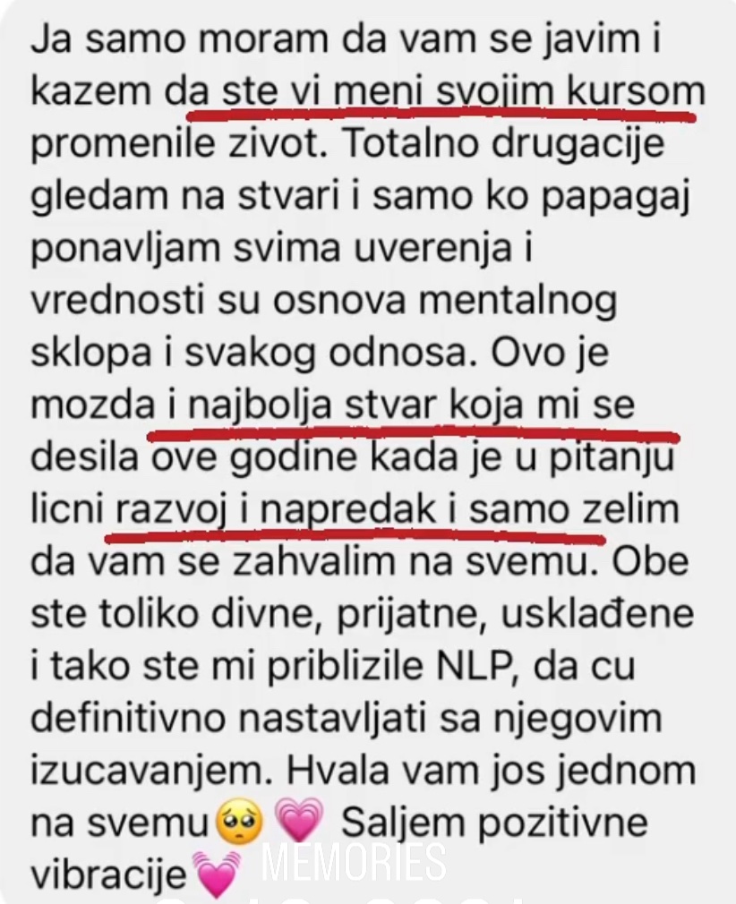 Kao učesnica radionice dobijaš 20% popusta na NLP Beginner edukaciju koja se održava u februaru 2026. NLP Beginner edukacija traje 15 sati i prvi od devet modula internacionalno sertifikovane NLP Practitioner edukacije. Ovo je tvoja prilika da upoznaš NLP metodologiju, naučiš kako je primeniti za lični i profesionalni napredak i produbiš znanje stečeno na radionici.